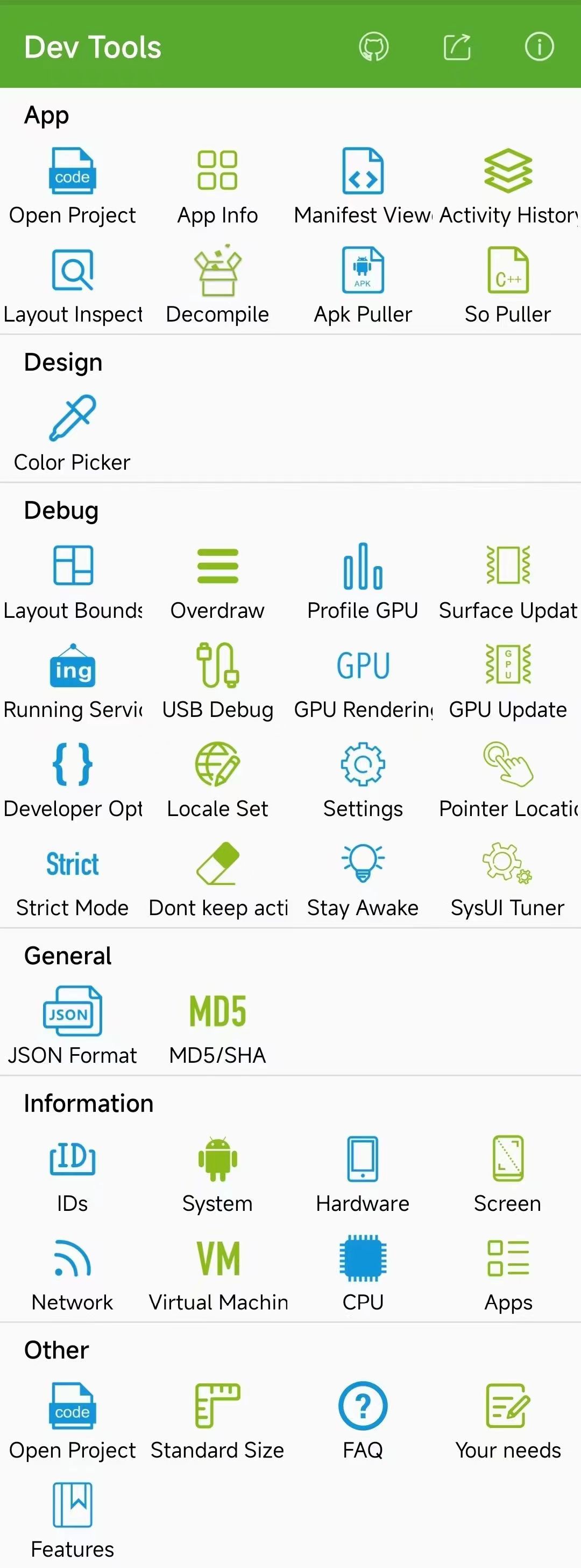● If you are an Android developer: It's your indispensable assistant definitely. You can use it to learn from other apps quickly, such as inspect view's ID, decompile to view its specific code implementation, extract its APK file or so file, view its Manifest file, pick color, other app info, etc; You can use it to debug quickly, open 16 common debug options quickly such as Layout Bounds and Pointer Location.